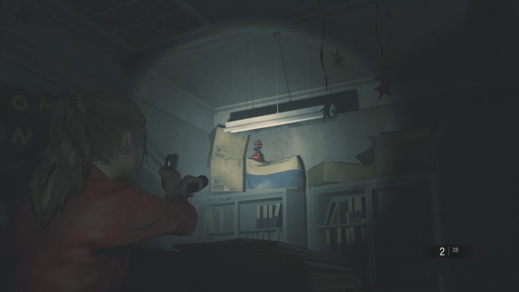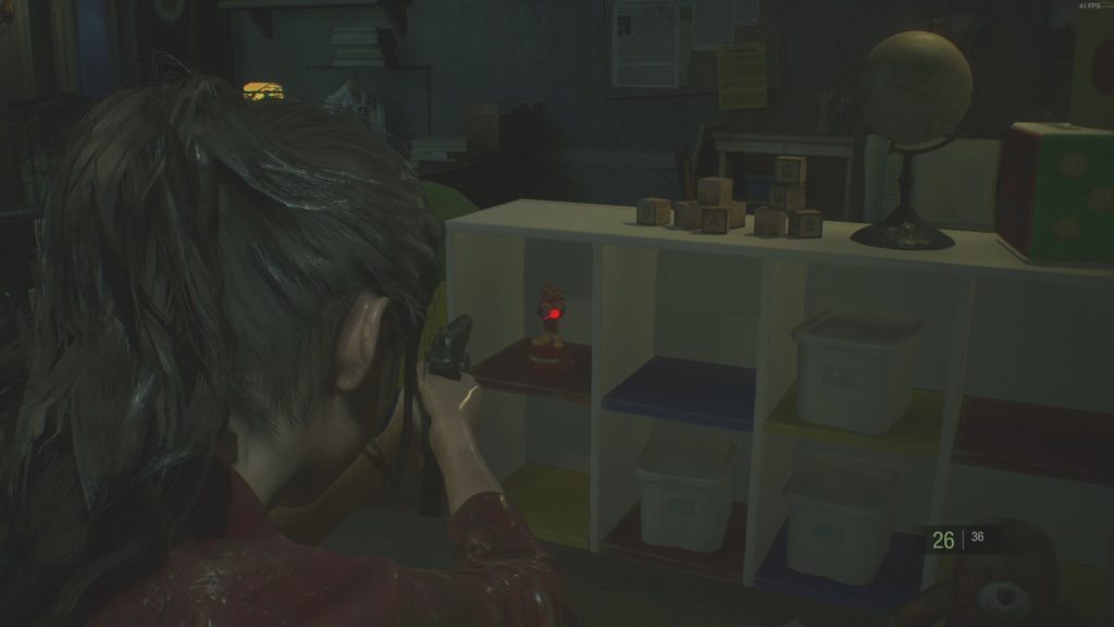 As soon as you can enter the West side of the Police Station, you will be able to enter the West Office. Once inside the office, there will be a zombie, leaning on a desk in the middle of the room. Make sure to kill it. Behind it, is light blue shelf. Mr. Raccoon Toy is located on top of the shelf, on some boxes.
