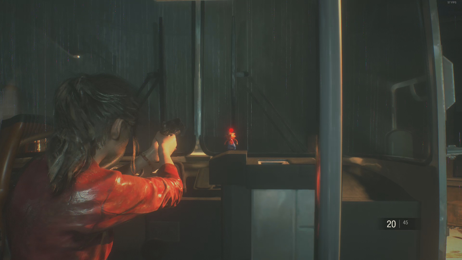 After a section of playing as Sherry, you will escape the Parking Garage as Claire. Follow the street and go through the Basketball Court. Shorty after exiting the Basketball Court, you will have to go through a zombie infested bus. Clear the bus and look for Mr. Raccoon Toy on dashboard of the bus.