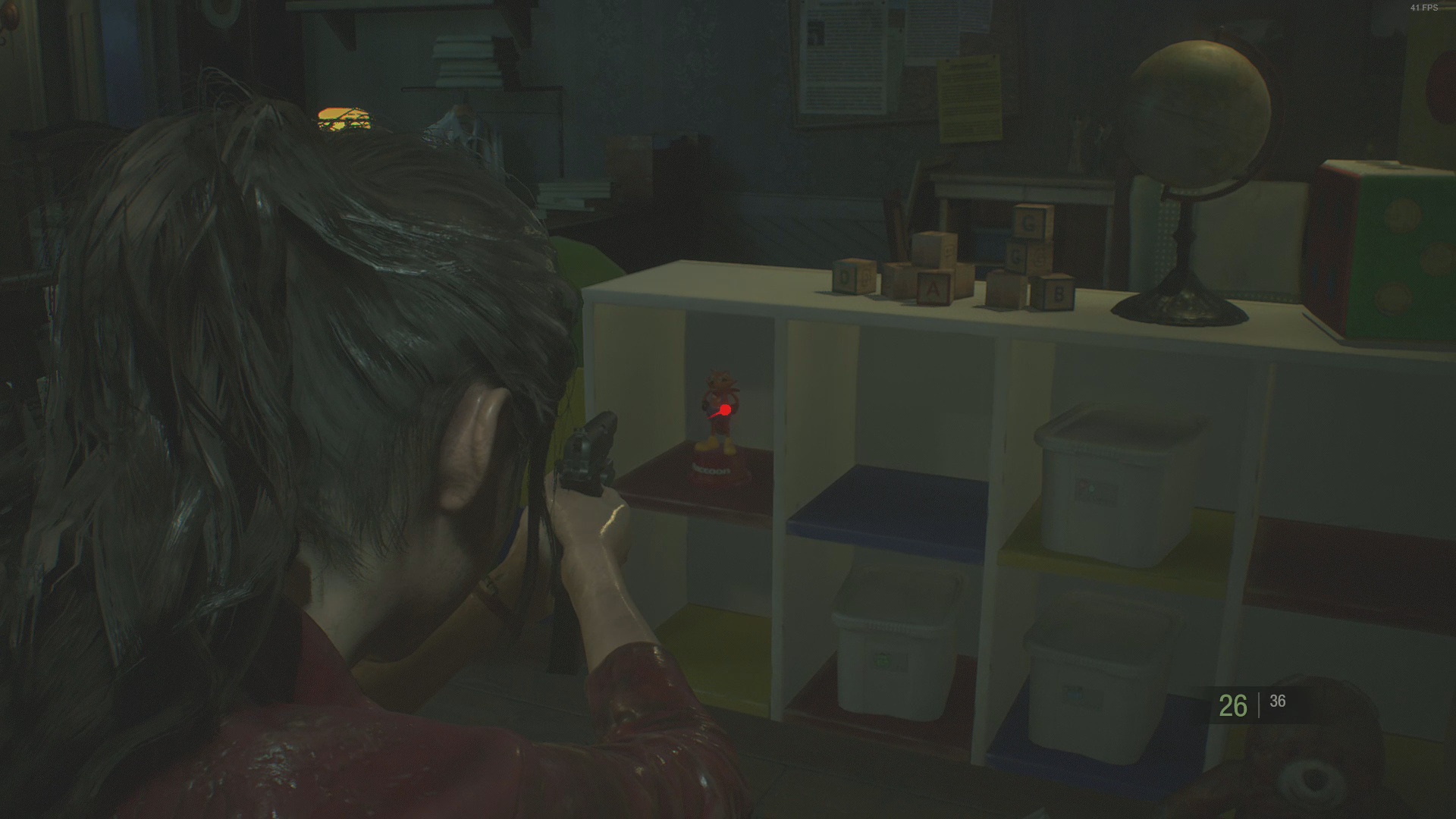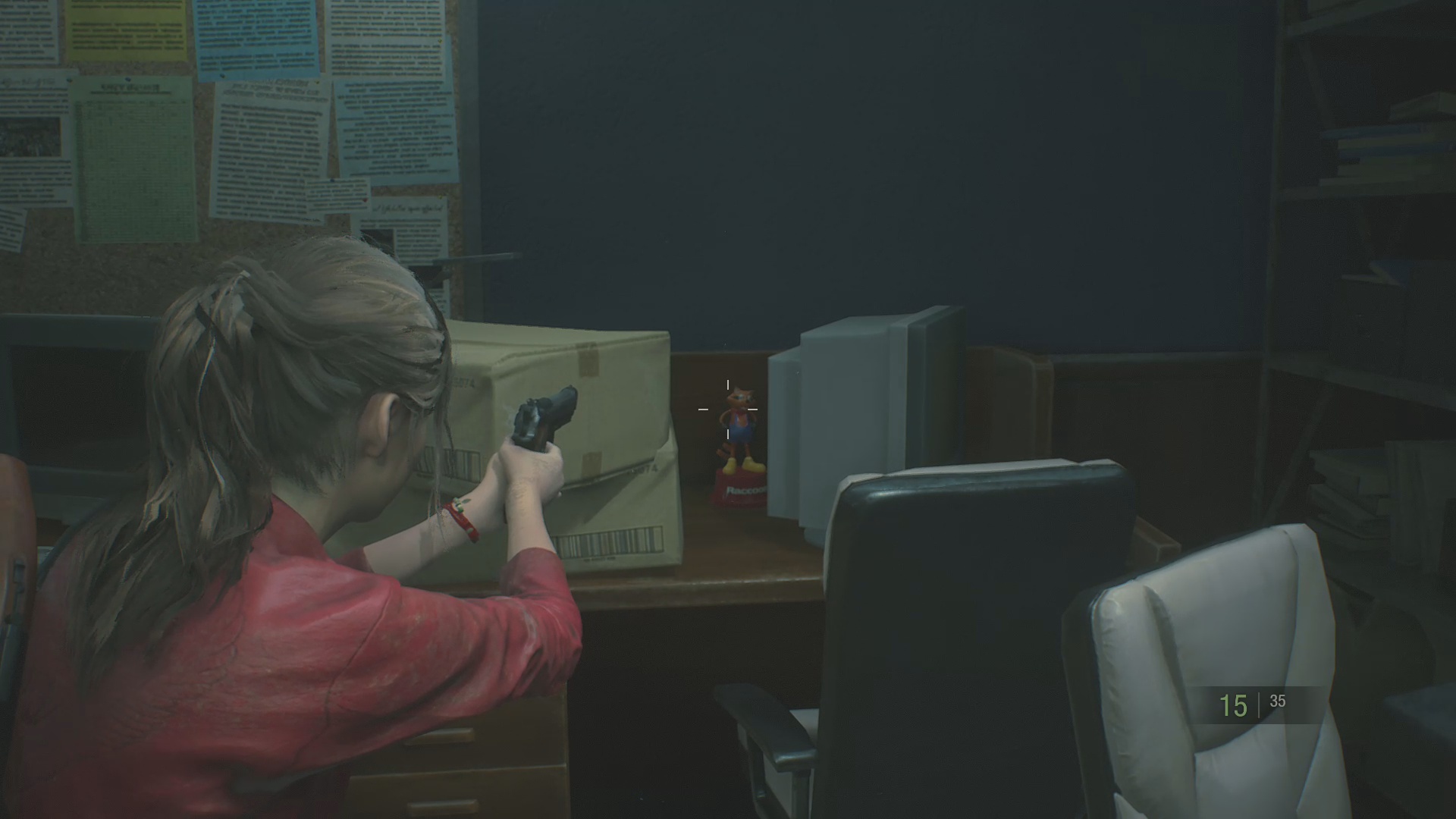 As soon as you can enter the West side of the Police Station, you will be able to enter the West Office. Once inside the office, there will be a zombie, leaning on a desk in the middle of the room. Make sure to kill it. Behind it, is light blue shelf. Mr. Raccoon Toy is located on top of the shelf, on some boxes.
