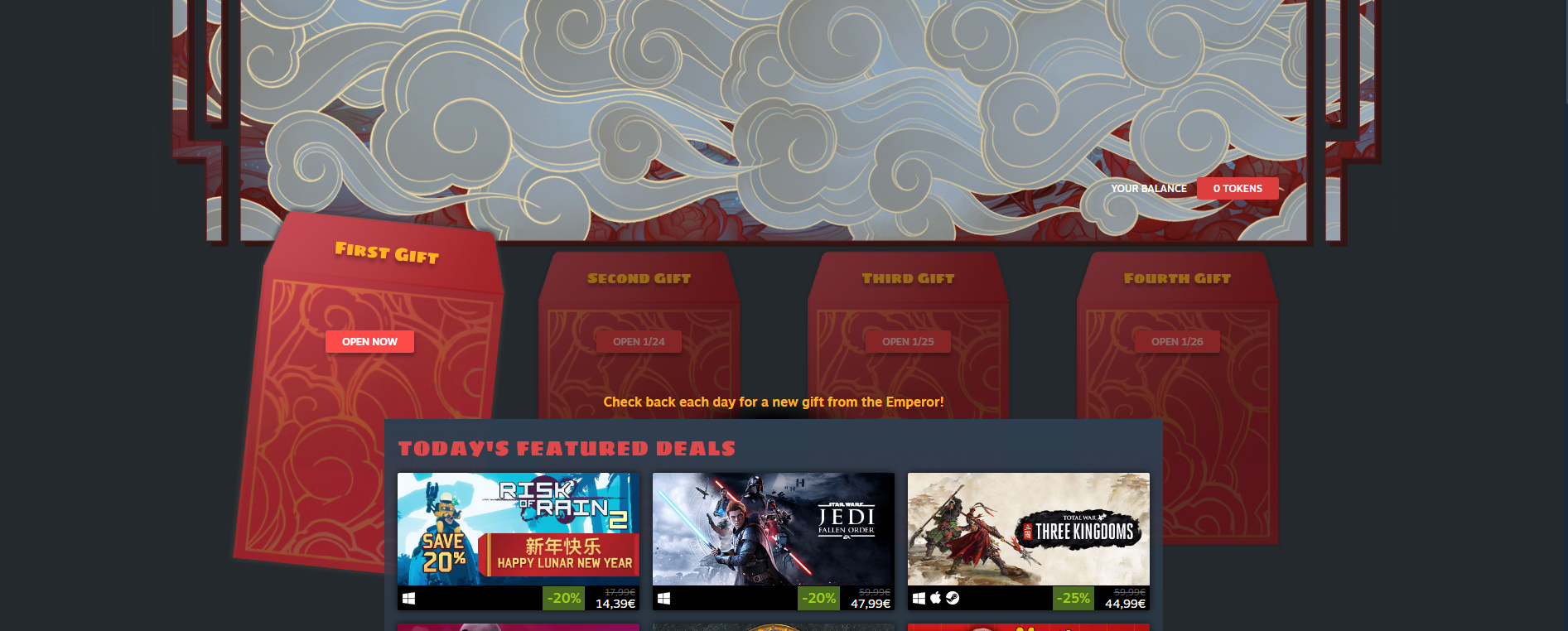 Lunar New Year Sale feature Year of the Rat Tokens, similarly to the Winter Sale. Each day of the sale, users will be given new Daily Red Envelope Gift to open.
